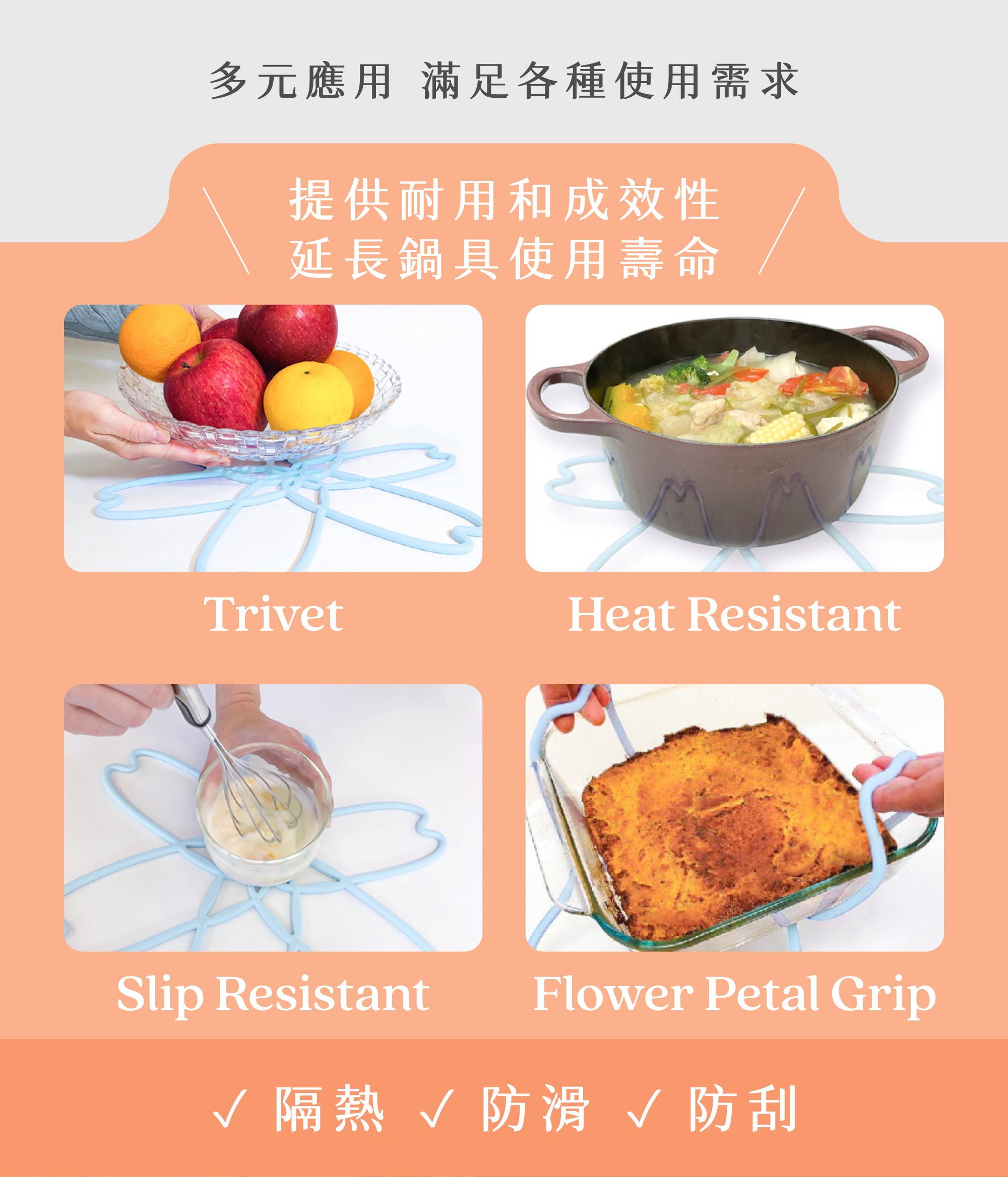 ●還可作為餐墊使用,支撐熱鍋、湯盤或大份料理,保護桌面,寬大的烘培烤盤也合適喔